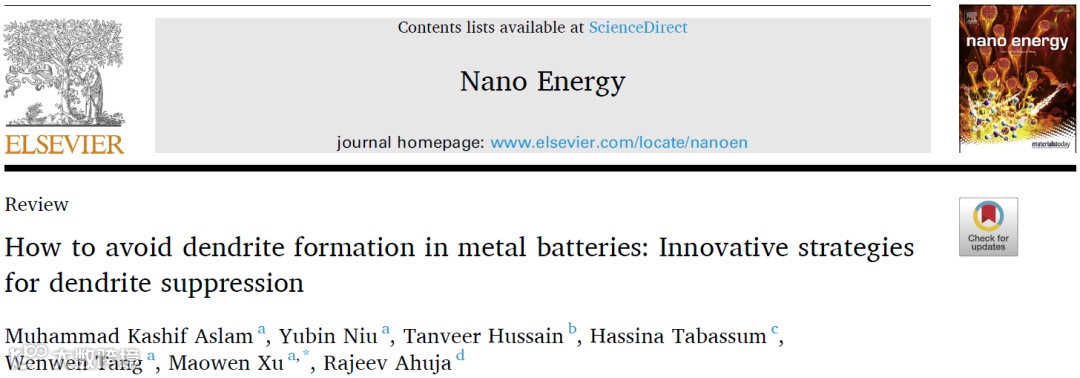 近日,来自西南大学的徐茂文教授课题组在国际知名期刊Nano Energy上发表题为“How to avoid dendrite formation in metal batteries: Innovative strategies for dendrite suppression”的综述文章。