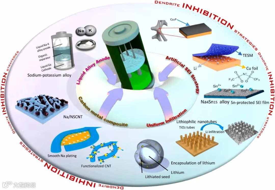 图1. 金属电池中抑制枝晶的部分解决方案