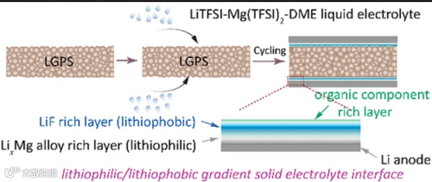 导读:这项工作通过在LGPS / Li界面上依次还原Mg(TFSI)2-LiTFSI-DME液态电解质中的盐和溶剂,在Li和LGPS之间形成了亲锂-疏锂梯度的界面层,从而解决了LGPS电解质的还原以及锂枝晶