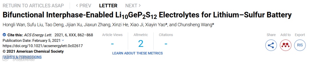 近日,马里兰大学王春生教授与姚霞银研究员等合作。在国际顶级期刊ACS Energy Letters上发表题为“Bifunctional Interphase-Enabled Li10GeP2S12 Electrolytes for Lithium–Sulfur Battery”的研究工作。