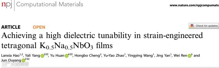 欧阳俊,齐鲁工业大学化工学院教授,“新能源材料化学与功能器件”科研团队负责人,教育部新世纪优秀人才,山东省“惠才卡”专家和省级领军人才。2010.04-2019.12期间在山东大学材料学院任教授和博士生导师。目前担任中国硅酸盐学会特种陶瓷分会理事和山东硅酸盐学会电子陶瓷专家委员会常务委员,Journal of Advanced Ceramics期刊编委,曾担任中国真空科学与技术学报理事,山东省清华校友会副秘书长。主要研究方向包括:(1)钙钛矿铁电、压电和介电陶瓷,及其薄膜、低维材料和原型器件的设计、制备和表征;(2)与半导体硅技术和柔性电子兼容的中低温薄膜材料制备和集成技术,包括室温镀膜技术;(3)高储能密度电介质材料; (4)光电、光热、防护和耐磨涂层的制备。在Nature Communications, Advanced Energy Materials、Energy Storage Materials, Advanced Functional Materials, npj Computational Materials, Acta Materialia, ACS Applied Materials & Interfaces, Scripta Materialia等国际期刊上发表SCI论文近100篇, 组织2次国际学术会议,在国际会议上做大会主题报告和分会邀请报告近20次,并多次担任国际学术会议分会主席。主编英文学术专著一本“Nanostructures in Ferroelectric Films for Energy Applications”(2019.06, Elsevier),获专利授权8项含国际专利1项,获中国硅酸盐学会2018年度特种陶瓷学术奖。主持和参与国内外科研项目30余项, 包括多项国家自然科学基金项目(主持)和省部级科研课题。课题组2020-2021年发表的其他代表性文章:(1) “Rhombohedral BiFeO3 thick films integrated on Si with a giant electric polarization and prominent piezoelectricity”, Acta Materialia,200 (2020), 305-314.(2) “Superparaelectric (Ba0.95,Sr0.05) (Zr0.2,Ti0.8)O3 Ultracapacitors”, Advanced Energy Materials, 2020, 2001778.(3) “Nonlinear electric field dependence of the transverse piezoelectric response in a (001) ferroelectric film”, Scripta Materialia, 189 (2020) 84–88.(4) “Integration-Friendly, Chemically Stoichiometric BiFeO3 Films with a Piezoelectric Performance Challenging that of PZT” ACS Applied Materials & Interfaces 12 (2020), 33899-33907.(5) “Achieving an Ultra-high Capacitive Energy Density in Ferroelectric Films Consisting of Superfine Columnar Nanograins” Energy Storage Materials 39 (2021), 81-88.(6) “Boosting energy storage performance of low-temperature sputtered CaBi2Nb2O9 thin film capacitors via rapid thermal annealing”Journal of Advanced Ceramics 10(2), (2021).(7) “Energy Storage and Leakage Current Characteristics of Low-Temperature-Derived Pb0.8La0.1Ca0.1Ti0.975O3 Thin Films Tailored by an Annealing Atmosphere”, J. Phys. Chem. C 2021, 125, 2831−2840.(8) “High Energy Performance Ferroelectric (Ba,Sr)(Zr,Ti)O3 Film Capacitors Integrated on Si at 400 °C”, ACS Applied Materials & Interfaces, https://doi.org/10.1021/acsami.1c01275 论文链接:https://doi.org/10.1038/s41524-021-00528-2