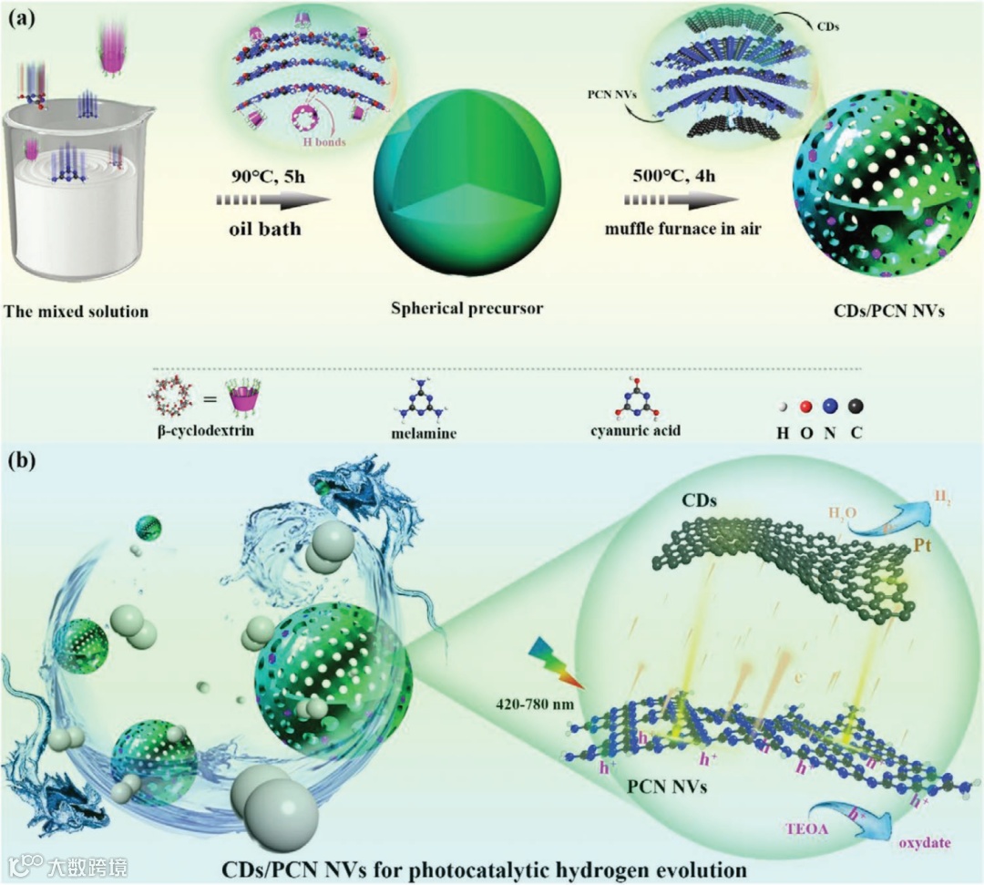 导读:本文通过构建0D碳点/3D多孔氮化碳纳米囊泡(简称CDs/PCN NVs)异质结构,报道了用于光催化析氢的高通量单光子激发途径。