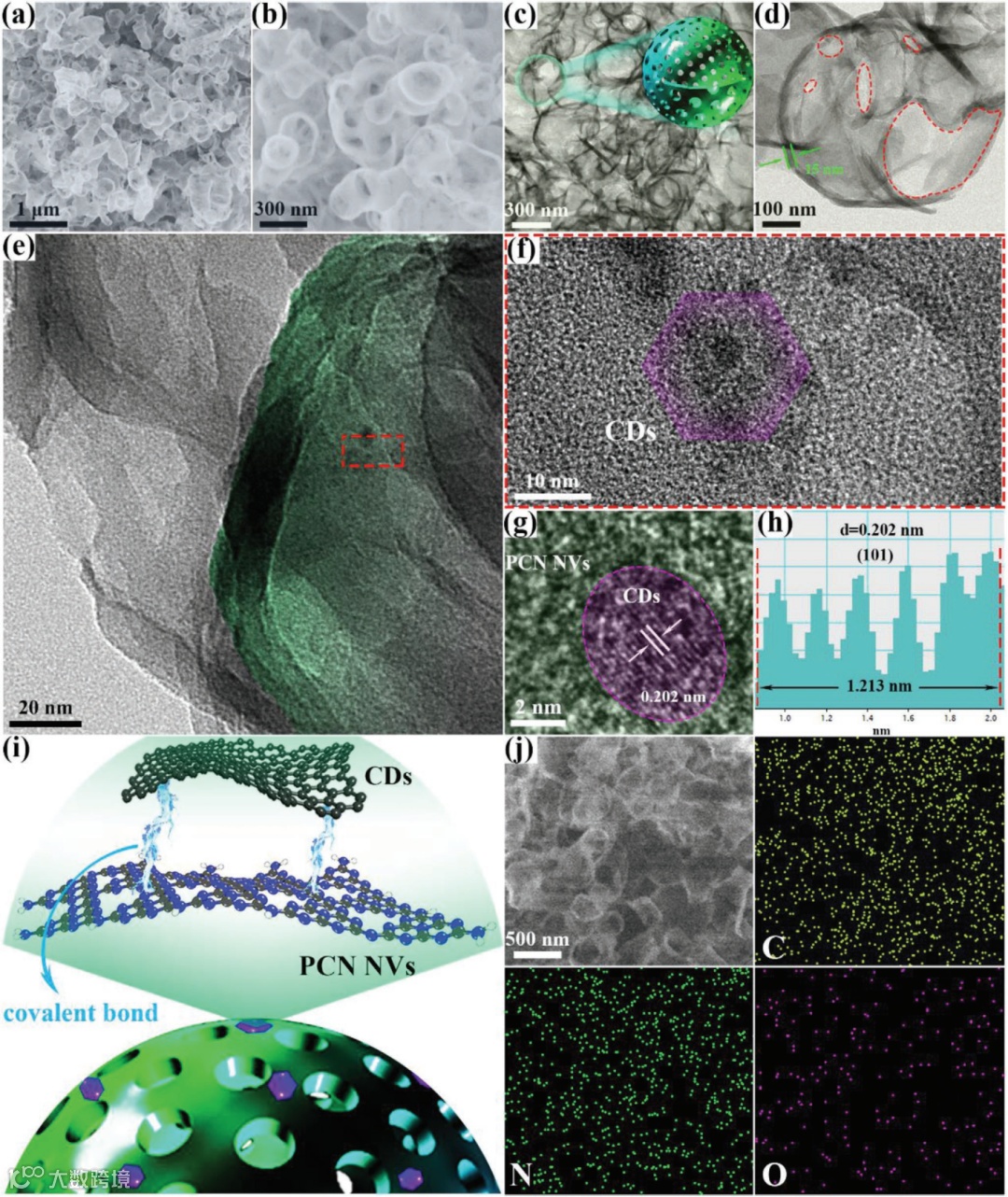 图3. CDs/PCN NVs异质结的物理结构表征 。