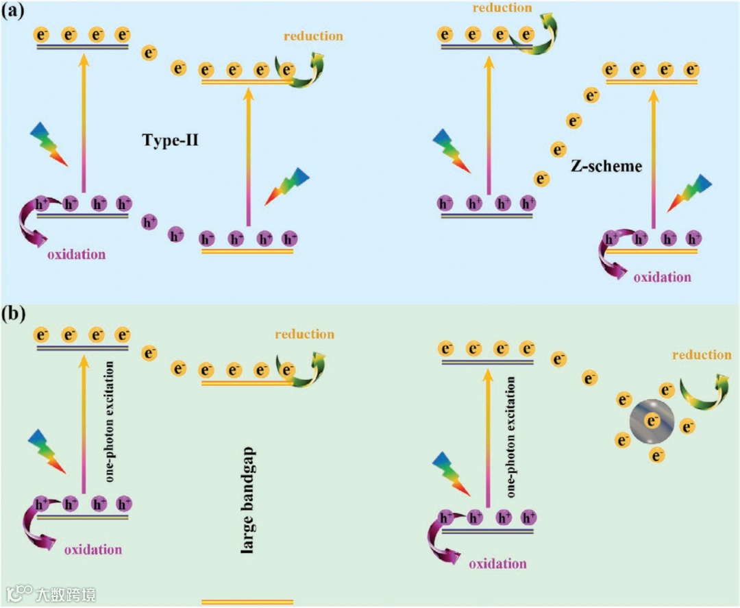 图1.光生载流子通过a)双光子激发途径和b)单光子激发途径传递示意图。