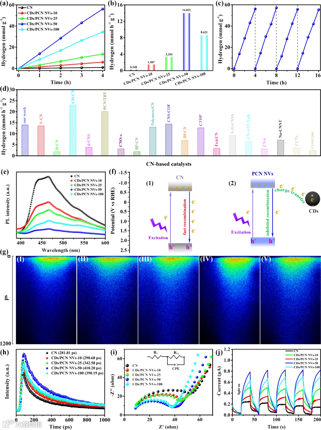 图4. CN和CDs/PCN NVs异质结的光催化产氢性能和电荷迁移特性。
