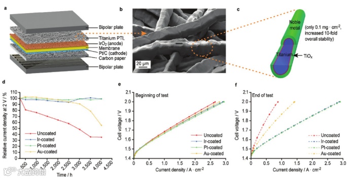 该工作首次展示了如何调整PTLs,使其界面在实际电解条件下保持良好的保护和抗腐蚀能力,时间约为4000小时。还证明了未受保护的PTLs的故障是由阳极催化剂层上超出氧化铱稳定性预期影响的额外致命降解机制引发的结果。