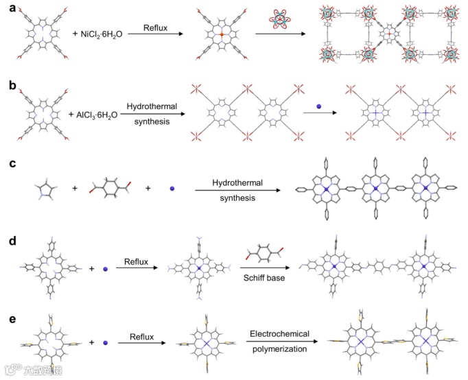 卟啉基框架材料的合成方法有很多,主要包括溶剂热法,一锅煮法,席夫碱反应法和电聚合法等等(图3)。