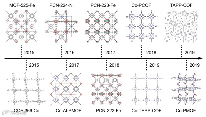 图2中按时间顺序描述了几种典型的基于卟啉分子的框架材料,系统地总结和讨论了卟啉基框架材料的发展历程。
