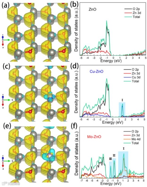 导读:这项工作发现用具有不同外部电子(Mo和Cu)的杂原子代替Zn位置可以在ZnO的费米能级附近调谐占据和未占据的轨道。