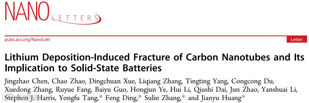 燕山大学黄建宇教授团队联合韩国基础科学研究院与韩国蔚山国立科技学院丁峰教授、美国滨州州立大学张宿林教授和美国劳伦斯伯克利实验室的Steve Harris教授,Nano Letters观点:锂沉积诱导碳纳米管断裂及其对固态电池的影响
