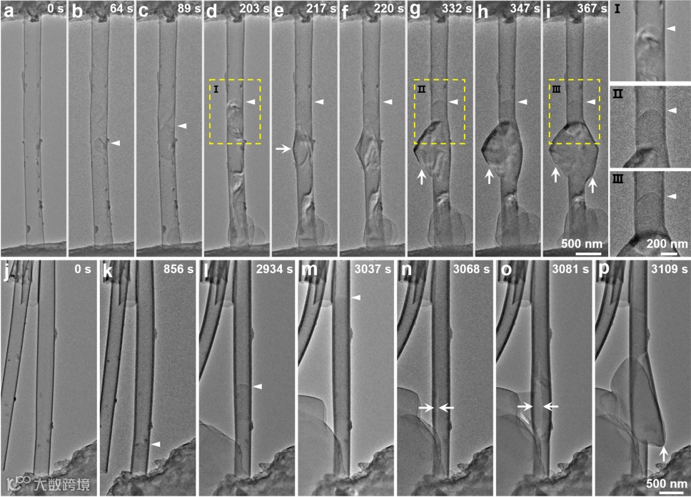 图1. 原位观察金属锂在空心碳管内部的沉积及诱导碳纳米管断裂过程