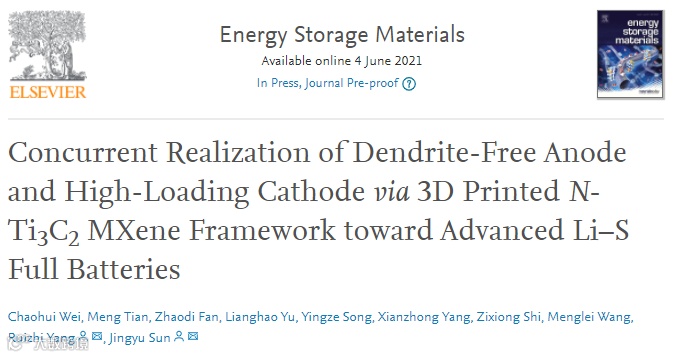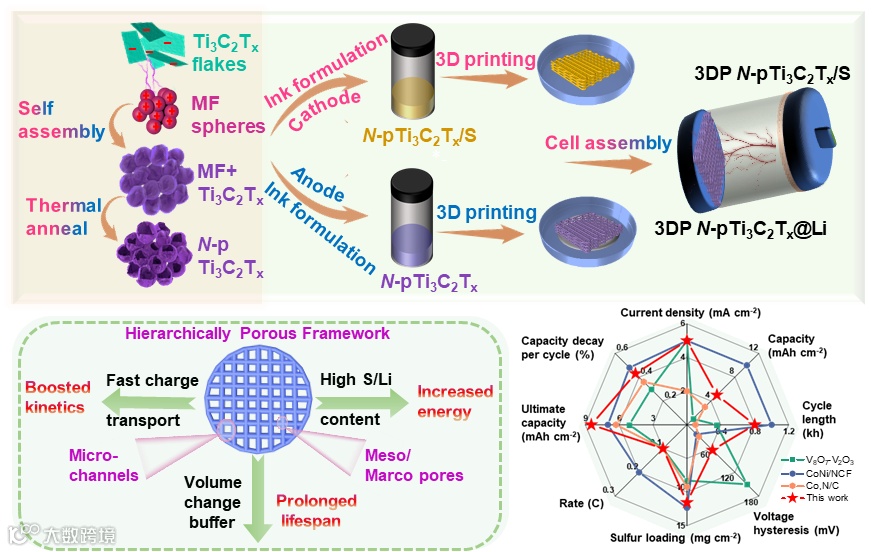导读:该论文提出使用3D打印N-Ti3C2框架用于电池正负极的同时管理,实现了高负载、无枝晶的高性能锂硫电池。