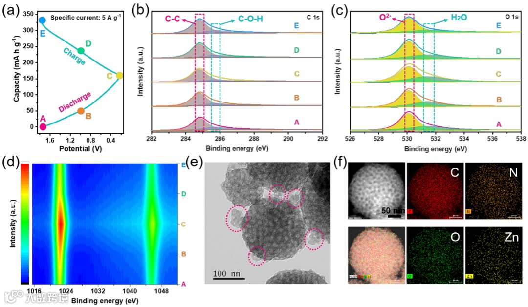 通过非原位的XPS测试,进一步研究了N-HPCSs-ZIC在特定的放电/充电状态下的反应机理。在C 1s的非原位的XPS图中,C−OH的峰强度从1.8−0.2 V逐渐减小,然后从0.2−1.8 V逐渐增强,说明C−OH在放电/充电过程中参与了一个高度可逆的化学反应。