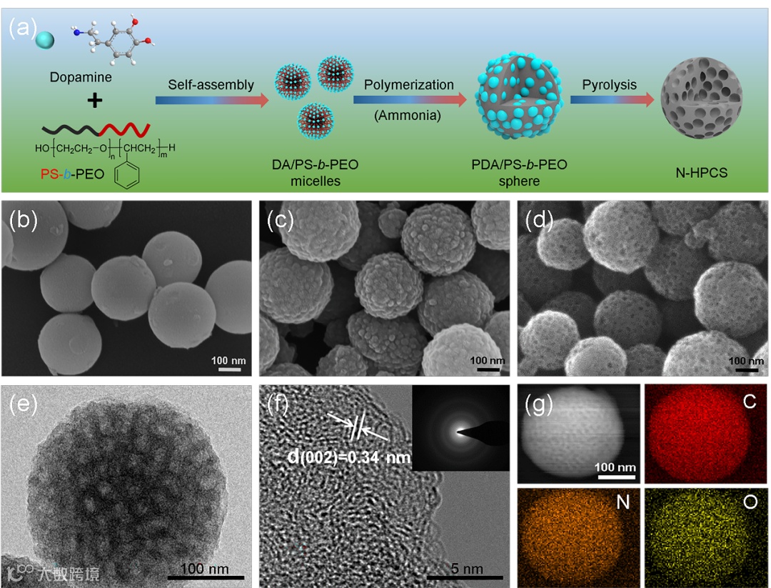 图1. 氮掺杂分级多孔碳球的制备流程示意图及形貌表征。