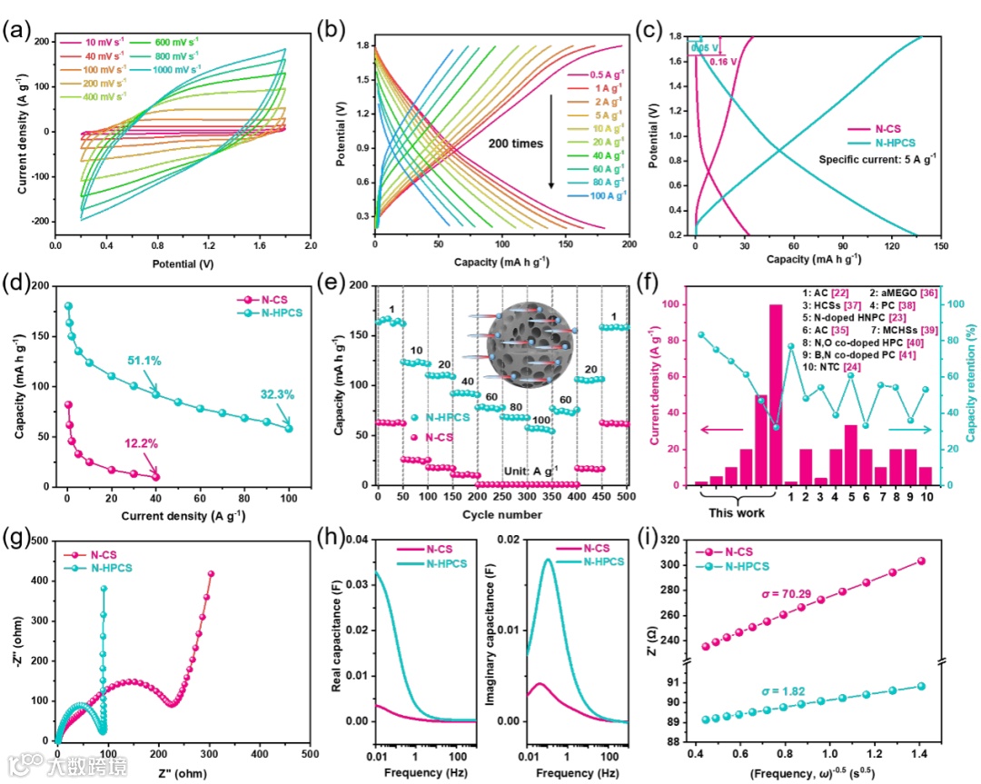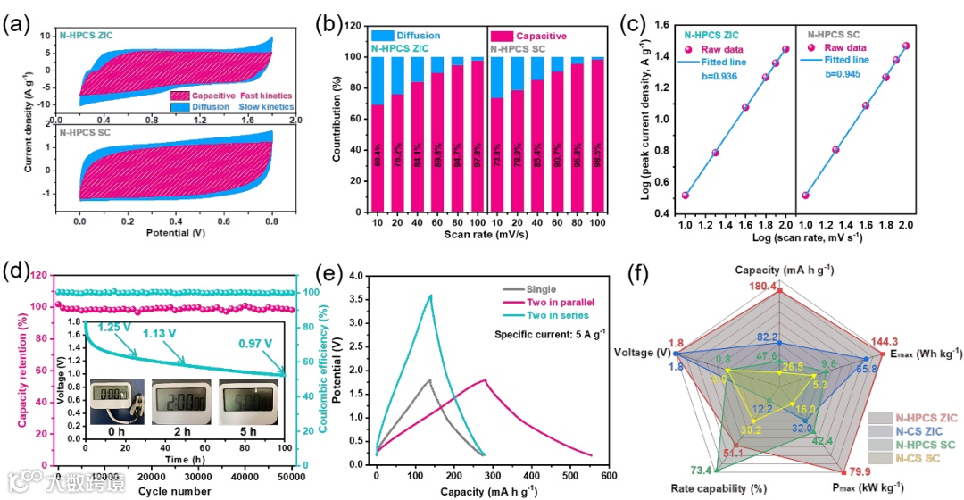 图 3. 基于N-CS和N-HPCS电极的水系锌离子电容器的电化学性能。