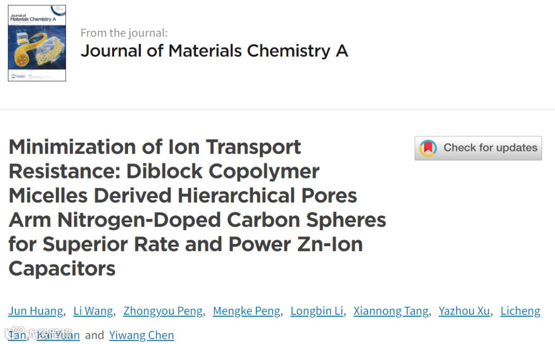近日,来自南昌大学和江西师范大学的袁凯教授和陈义旺教授,在国际知名期刊Journal of Materials Chemistry A上发表题为“Minimization of Ion Transport Resistance: Diblock Copolymer Micelles Derived Hierarchical Pores Arm Nitrogen-Doped Carbon Spheres for Superior Rate and Power Zn-Ion Capacitors”的研究论文,文章入选HOT Papers