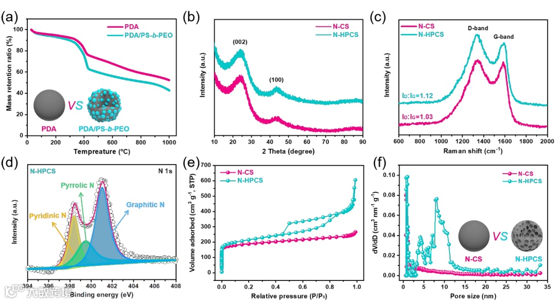 此外,N-HPCS具有较高的D/G比,说明PS-b-PEO模板的引入增加了碳化过程中碳球表面的无序性和缺陷程度。利用XPS检测到N-HPCS含有三种氮官能团,分别为石墨氮、吡咯氮和吡啶氮,其中吡啶氮和石墨氮是其主要的含氮形式。
