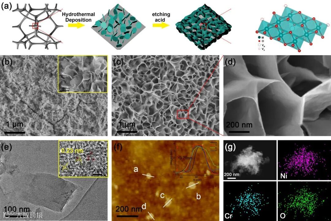首先通过简单的水热法在镍泡沫表面生长原始的 NiCr-LDH 纳米片(NiCr-LDH),随后,对NiCr-LDH进行原位酸刻蚀,转化为超薄原子空位限制的NiCr-LDH纳米片阵列。
