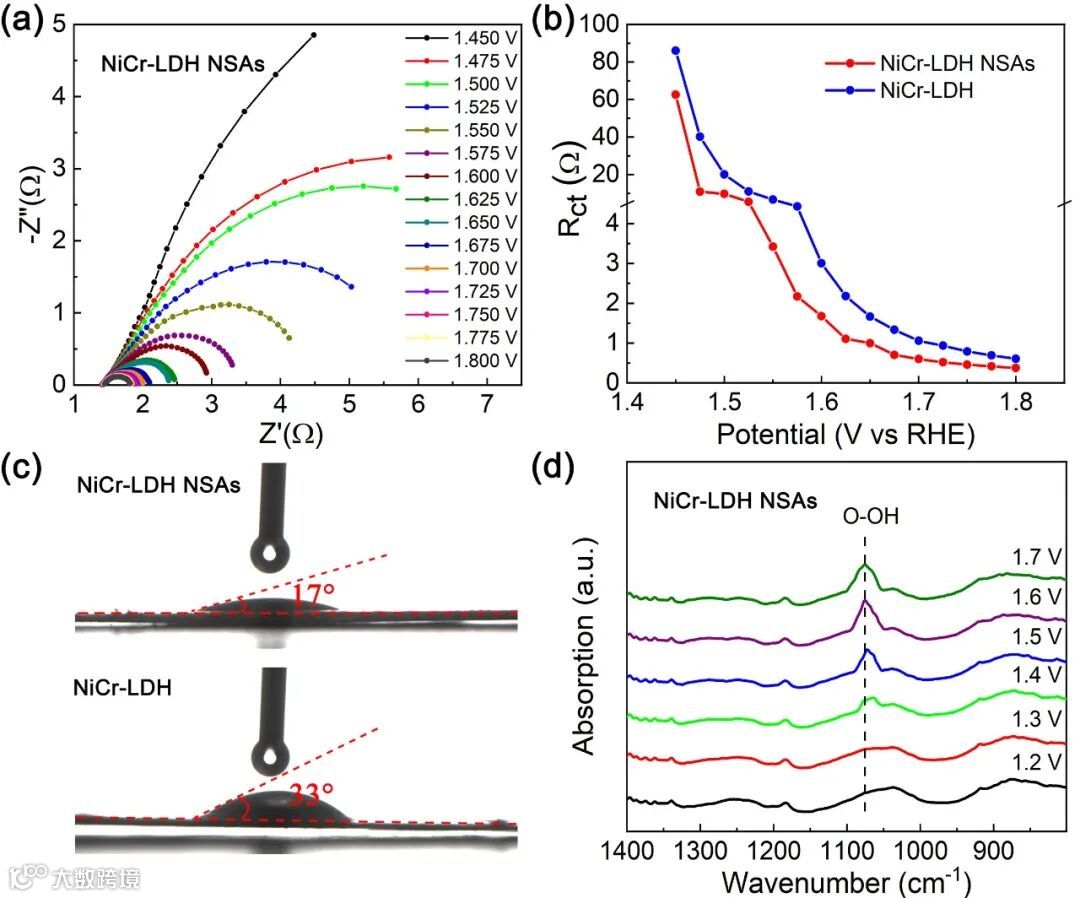 图 4. (a) NiCr-LDH NSA 在 1.0 M KOH 中不同施加电位下获得的奈奎斯特图,(b) 电荷转移电阻对施加电位的响应,(c)接触角测量,(d) NiCr-LDH NSA 在 OER 过程中的 Operando SR-FTIR 测量。