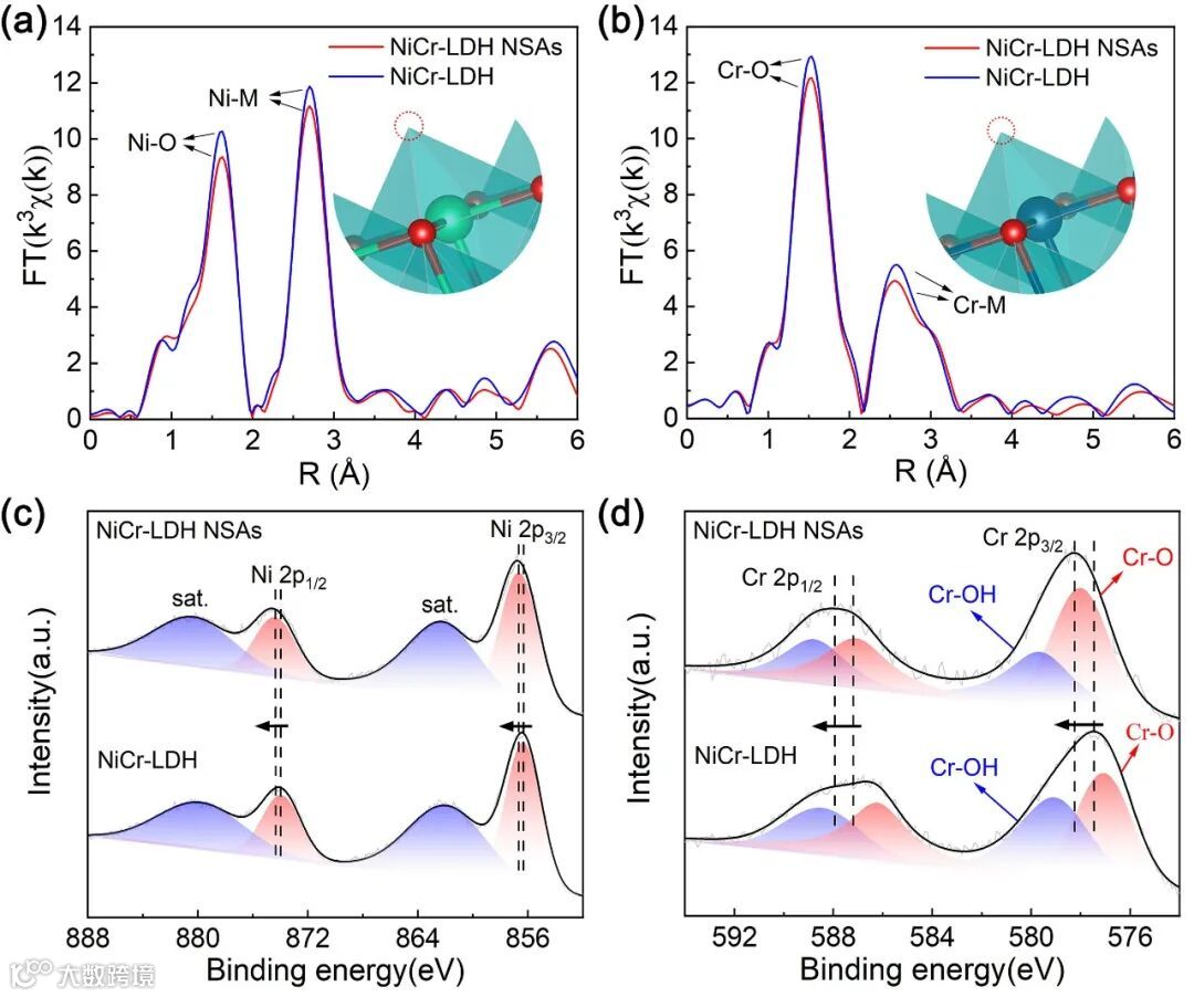 图2. NiCr-LDH NSAs和NiCr-LDH的(a) Ni K-edge EXAFS谱的傅里叶变换曲线,(b) Cr K-edge EXAFS谱的傅里叶变换曲线,(c)高分辨率Ni 2p XPS谱,(d)高分辨率Cr 2p XPS谱。