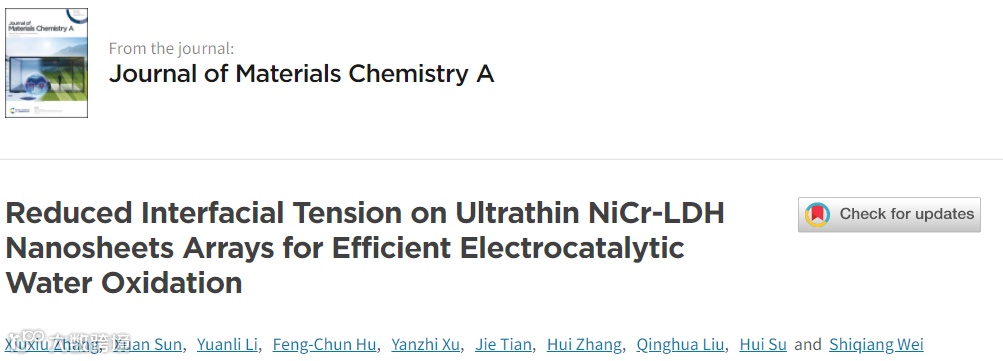 基于此,中国科学技术大学国家同步辐射实验室苏徽博士和胡凤春工程师在国际知名期刊Journal of Materials Chemistry A上发表的题为“Reduced Interfacial Tension on Ultrathin NiCr-LDH Nanosheets Arrays for Efficient Electrocatalytic Water Oxidation”的文章。