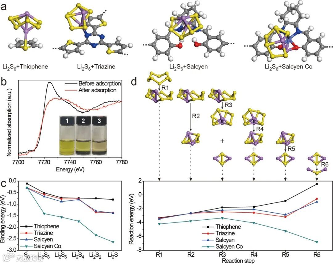 图 6. 用DFT模拟分析化学吸附和电催化效果。(a)噻吩、三嗪、salcyen和salcyen Co基底吸附Li2S6后的分子模型图。(b)Co-CMP吸附Li2S6前后的Co K-edge XANES图。小图是吸附实验对比图,(1) Li2S6的DOL/DME溶液(1:1 v/v) ([Li2S6]0 = 0.21 mg mL1, 5 mL),(2) 含有5 mg CMP的Li2S6溶液,(3) 含有5 mg Co-CMP的Li2S6溶液。(c)不同基底对不同硫物种的结合能图。(d)在不同基底上,不同正极反应的反应能图。