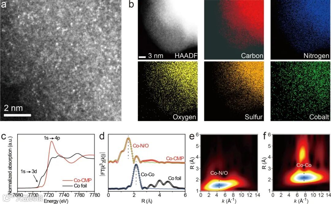 图 2. Co-CMP中单原子钴催化剂表征。(a)Co-CMP的HAADF-STEM图。(b)Co-CMP的HAADF-STEM图和相应的元素分布图。(c)Co-CMP和钴箔的Co K-edge XANES谱图。(d)Co-CMP和钴箔FT-EXAFS的R空间谱图(实线:拟合数据)。(e和f)Co-CMP和钴箔的小波转换图。