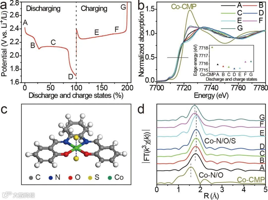 图 5. 用XANES分析电催化效果。(a)用于Co K-edge XANES测试的不同电化学状态在充放电曲线中的示意图。(b)S@Co-CMP正极的Co K-edge XANES谱图。(c)salcyen Co和硫原子络合的分子模型图。(d)S@Co-CMP正极 k3加权的FT-EXAFS R空间数据。