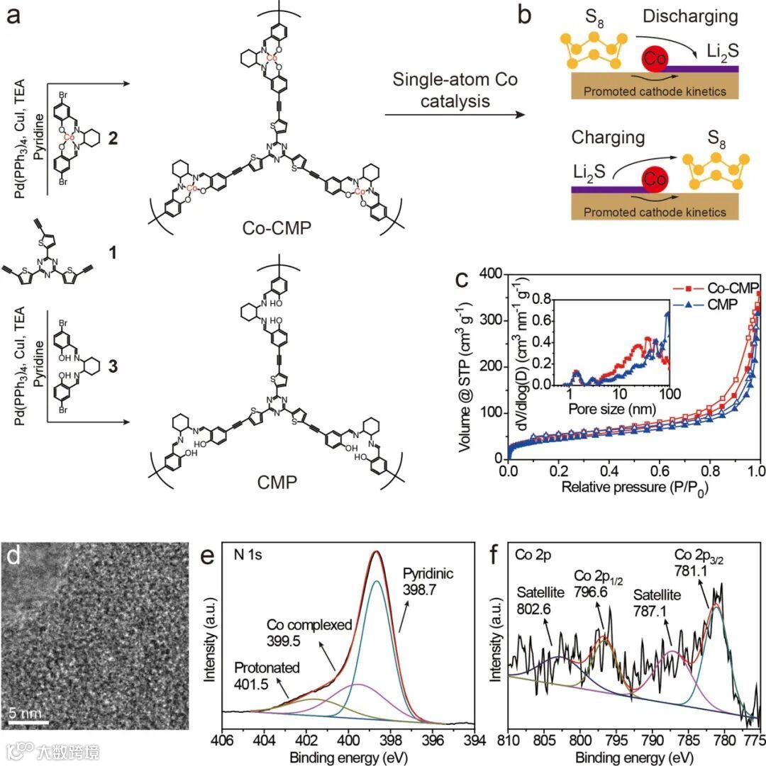 图 1. Co-CMP的合成与结构表征。(a)Co-CMP与CMP的合成路线。(b)SAC催化硫正极反应的示意图。(c)Co-CMP和CMP的N2吸脱附和孔径分布曲线。(d)Co-CMP的HRTEM图。(e)Co-CMP的XPS N 1s谱图。(f)Co-CMP的XPS Co 2p谱图。