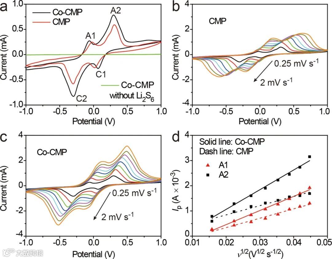 图 3. 利用对称电池研究SAC Co的电催化效果。(a)在0.25 mV s1扫速下,Co-CMP和CMP的循环伏安(CV)图。(b和c)CMP和Co-CMP在不同扫速下的CV图(0.252.0 mV s1)。(d)Co-CMP和CMP的Ip1/2图。