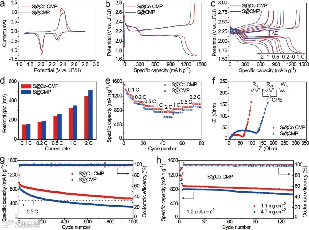 图 4. 锂硫电池的电化学表征。(a)0.1 mV s1扫速下的CV图。(b)0.1 C下的充放电曲线图。(c)不同倍率下的充放电曲线图。(d)极化电压对比。(e)倍率数据。(f)EIS数据(实线:拟合数据)和等效电路。(g)0.5 C下的长循环稳定性。(h)不同硫负载量下S@Co-CMP的循环稳定性。