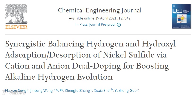 基于此,昆明理工大学王劲松和郭玉忠教授在国际知名期刊Chemical Engineering Journal上发表题为“Synergistic Balancing Hydrogen and Hydroxyl Adsorption/Desorption of Nickel Sulfide via Cation and Anion Dual-Doping for Boosting Alkaline Hydrogen Evolution”的研究文章。