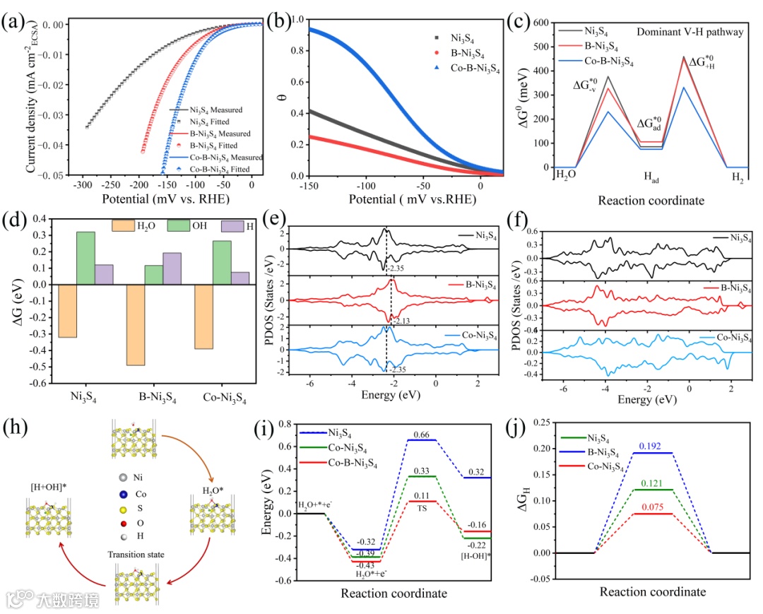图1. (a-c)微观动力学模型分析Co和B掺杂对碱性HER动力学过程影响;Co和B掺杂对(d)*H和*OH吸附能,(e)Ni的d带中心和(f)S的p带中心的影响;(h-j)DFT计算水解离过程势垒。