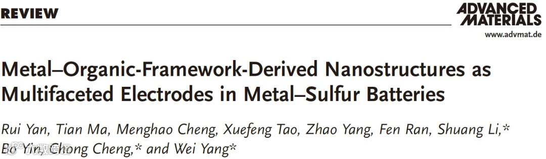 近日,四川大学杨伟教授,程冲研究员,柏林工业大学李爽博士Advanced Materials (影响因子:27.398)上发表题为“Metal-Organic Framework-derived Nanostructures as Multifaceted Electrodes in Metal-Sulfur Batteries”的综述文章。
