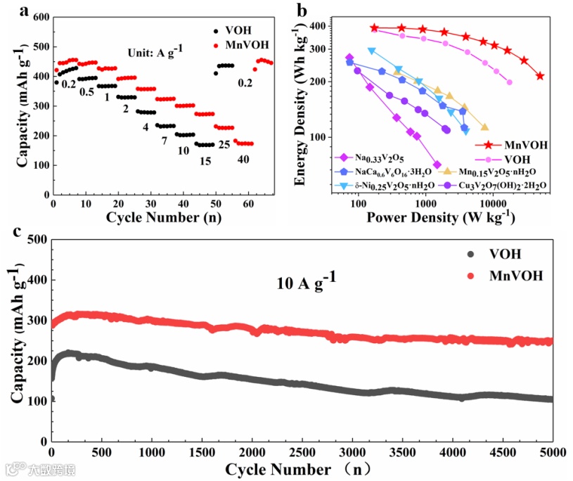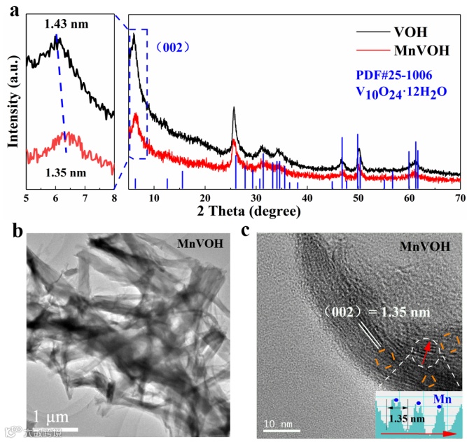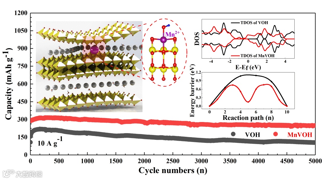 对于钒氧化物结构影响方面:形成Mn-O配位键饱和了钒氧化物结构中的部分悬挂键,加强了层间作用力,因此稳定了钒氧化物的晶体结构;同时Mn2+与层间水之间存在静电相互作用,因此也加强了层间水的稳定性。进一步结合理论计算表明:层间引入的Mn2+调节了钒氧化物的电子结构提升了导电性。 -