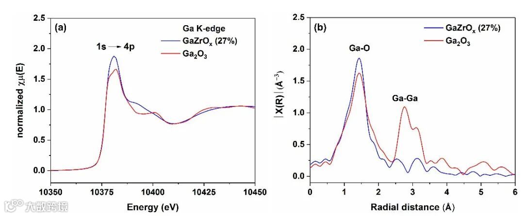 图 3. (a) 室温下GaZrOx(27%)催化剂和参比Ga2O3的(a)归一化Ga K-edge XANES谱,(b)傅里叶变换Ga K-edge EXAFS谱。