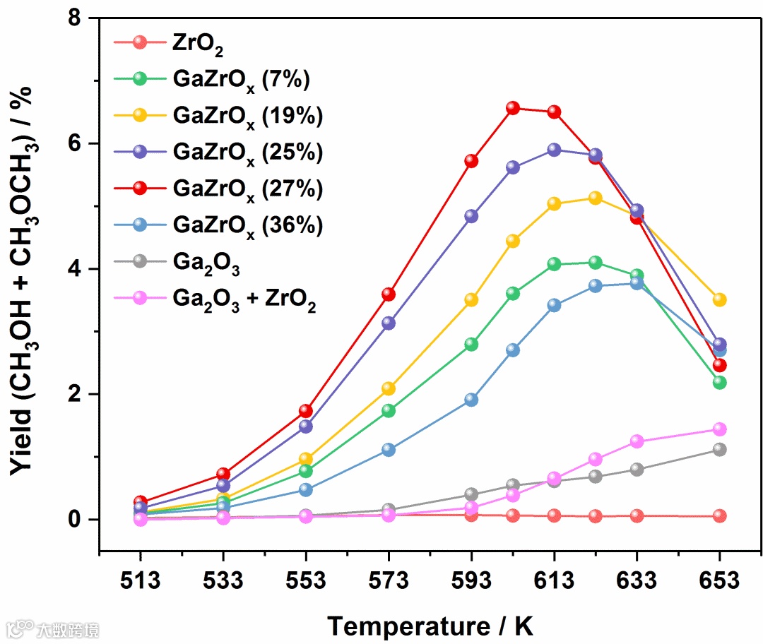 图 1. GaZrOx催化剂中Zr和Ga的强协同作用证据。不同温度下ZrO2,GaZrOx(7,19,25,27,36%),Ga2O3以及物理混合(Ga2O3 + ZrO2)催化剂的甲醇和二甲醚的产率图。反应条件:T = 513-653 K,P = 3.0 MPa,H2/CO2 = 3/1,GHSV = 24,000 ml/(gcat h)。