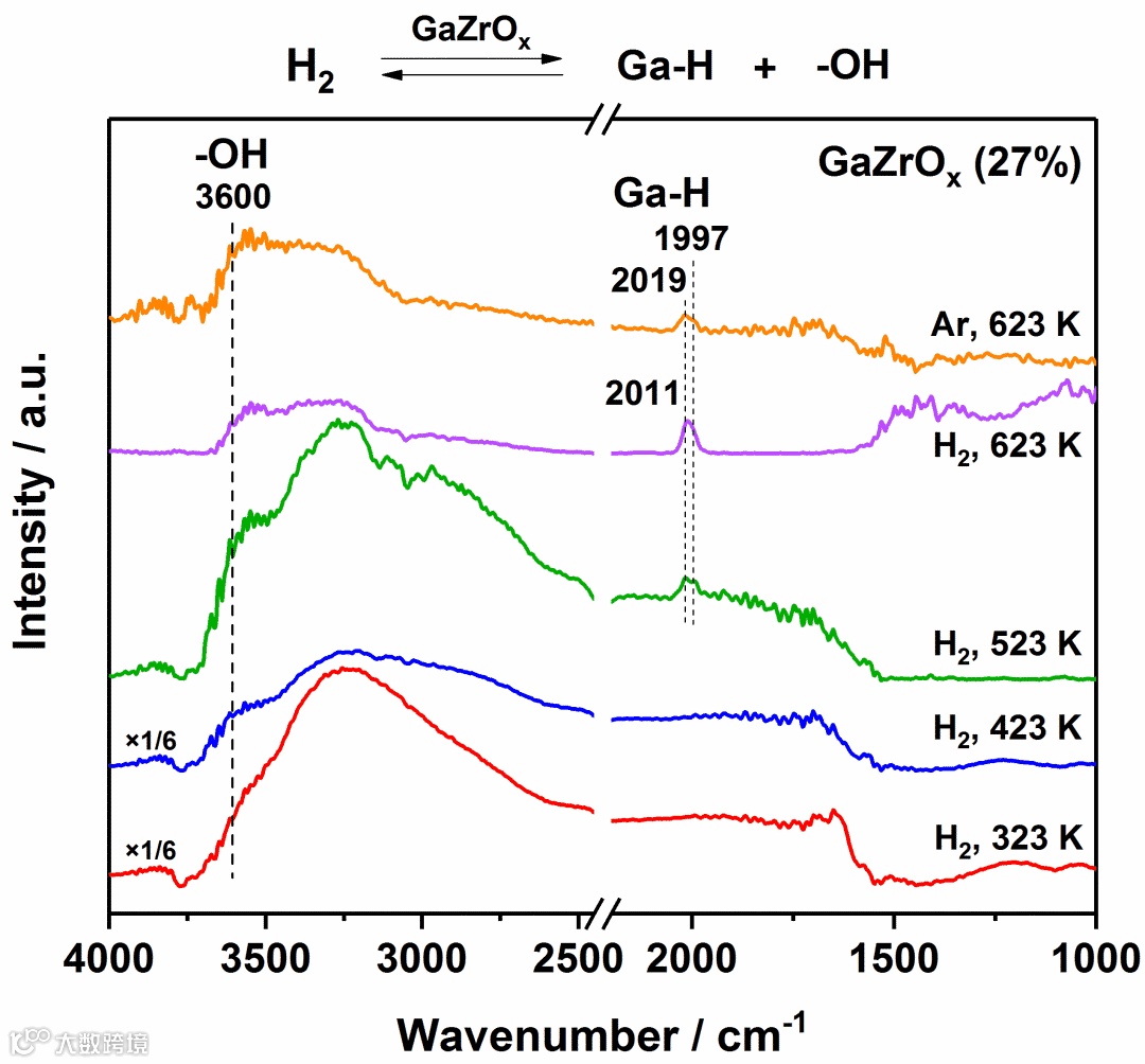 图 4. 在GaZrOx(27%)催化剂上进行H2活化的in situ DRIFTS谱。测试条件:323-623 K,常压,H2或Ar流量为20 std ml/min。