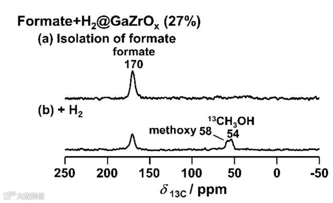 图 7. GaZrOx(27%)催化剂上表面甲酸盐物种发生氢化反应的13C CPMAS NMR谱图。(a)将图6 (c)中的样品在393 K抽真空30分钟后分离出了甲酸盐物种。(b)将图7(a)中的甲酸盐物种吸附H2后在523 K加热20分钟。