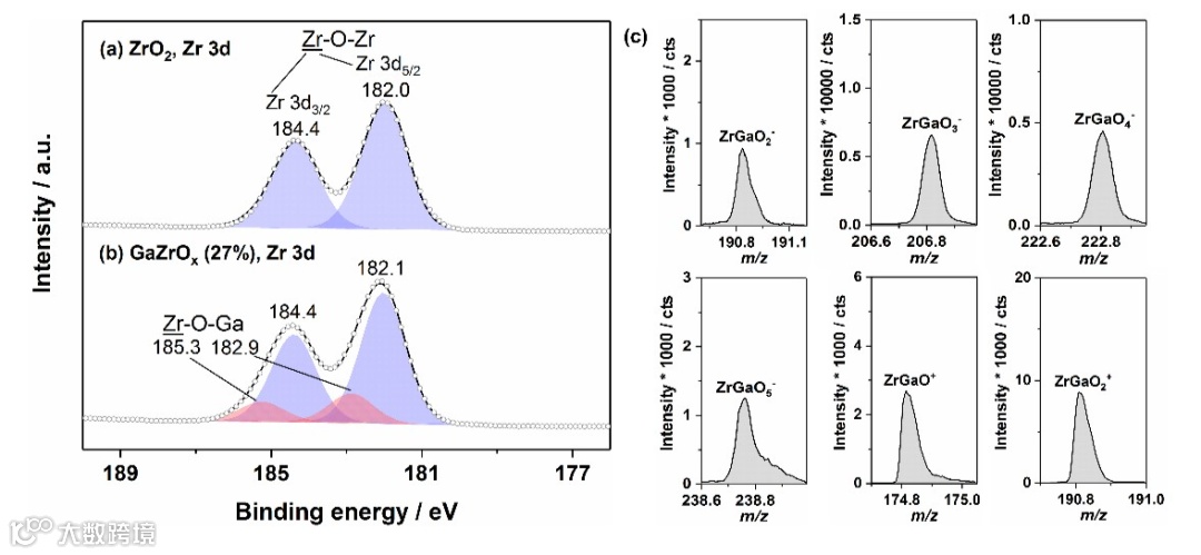 图 2. (a-b)ZrO2和GaZrOx(27%)催化剂的Zr 3d XPS图。黑线是原始光谱,灰色圆圈是拟合的光谱,浅红色和浅紫色区域是拟合出来的组分。(c) ToF-SIMS检测出的GaZrOx(27%)催化剂的部分负离子和正离子碎片。