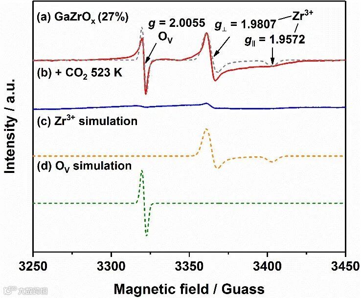 图 5. 通过EPR研究GaZrOx(27%)催化剂上的CO2活化。(a)活化后的GaZrOx(27%)催化剂的EPR谱。(b)将图5(a)中活化后的样品吸附CO2并在523 K下加热20分钟。(c)Zr3+的拟合峰。(d)Ov的拟合峰。图中虚线表示拟合峰。图5(a)中的拟合峰与实际谱图有些许偏差是因为催化剂粉末在进行测试时具有各向异性,而模拟数据则假定了其各向同性参数。