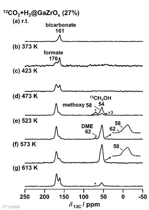 图 6. 不同温度下GaZrOx(27%)催化剂上CO2氢化的13C CPMAS NMR谱图。(a)室温(r.t.),(b)373 K,(c)423 K,(d)473 K,(e)523 K,(f)573 K,(g)613K。(*)表示自旋边带。