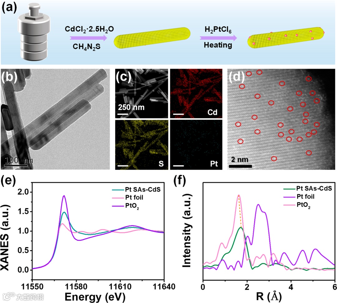 图1. Pt SAs-CdS 的合成步骤和单原子的电镜及同步辐射表征。