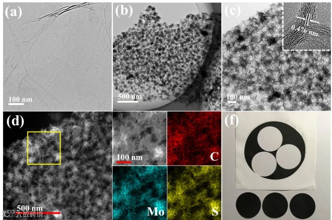 图2. (a)GO的TEM图。(b,c) FM@G的TEM图和(d) HAADF-STEM图及相应元素分布。(e)FM@G改性的隔膜照片。