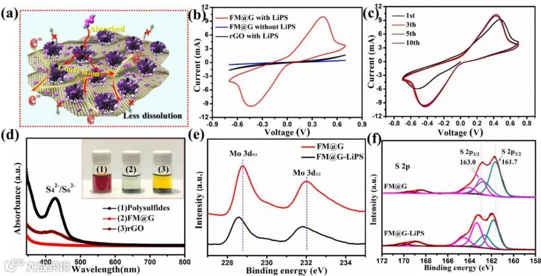 图5 (a)放电过程中多硫化物在FM@G纳米片上吸附/转化的示意图。(b)FM@G和rGO对称电池的CV测试;(c)FM@G对称电池CV循环测试。(d)多硫化物吸附实验及紫外-可见光谱测试。(e,f)FM@G和FM@G-LiPS的XPS光谱研究。