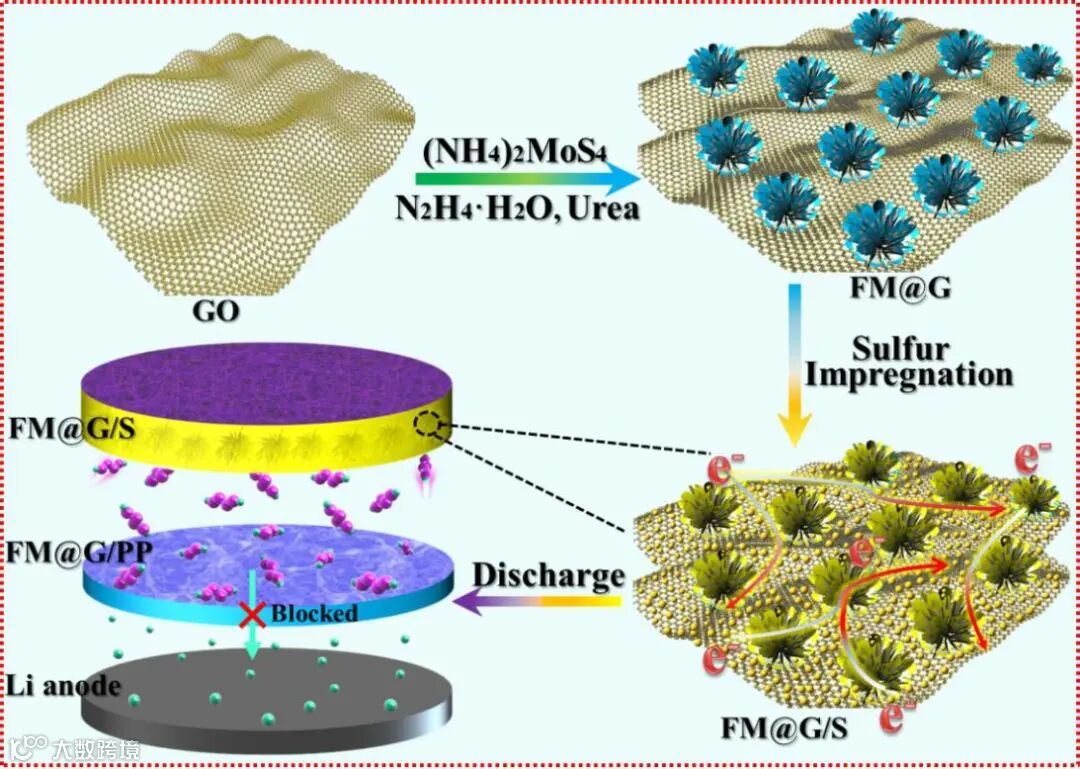 导读:该研究制备了一种在石墨烯上均匀负载金属相硫化钼纳米花的高导电复合材料(FM@G),并将其用于锂硫电池正极和隔膜的系统改性。