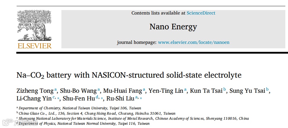 近日,来自台湾大学的刘如熹教授、中国科学院金属研究所的尹利长研究员与台湾师范大学的胡淑芬教授合作,在国际知名期刊Nano Energy上发表题为“Na–CO2 battery with NASICON-structured solid-state electrolyte”的文章。