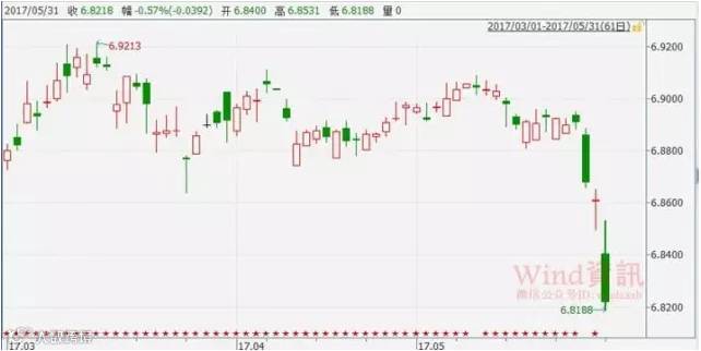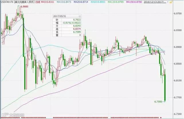 5月25日起,离岸人民币强势走高,31日当天离岸人民币对美元刷新去年11月以来最强水平,盘中连破6.82、6.81、6.80、 6.79、6.78、6.77、6.76七道关口,续创7个月新高至6.7595。