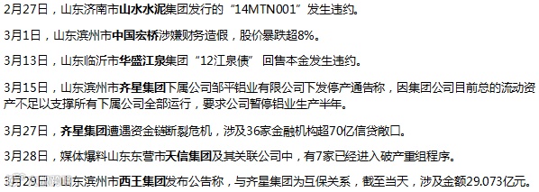以上违约企业中,山水水泥和华盛江泉属于个体资质恶化,天信集团源于所在城市资源枯竭和转型失败,真正引发市场地震的是齐星债务危机,被牵连陷落的滨州市邹平县企业,包括齐星、西王、宏桥和魏桥。
