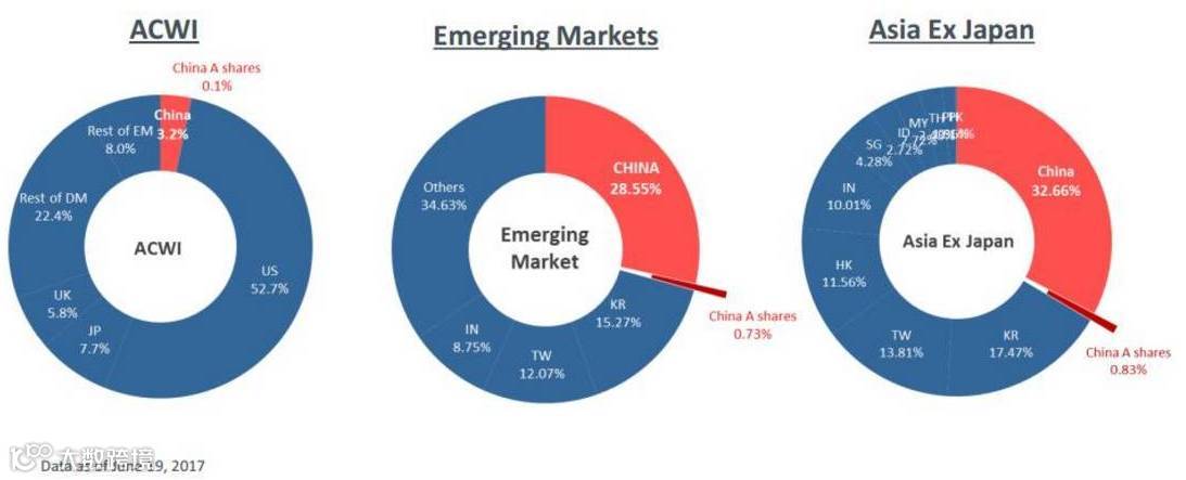 A股分别在MSCI全球指数、新兴市场指数和除日本外亚洲指数的权重(来自MSCI)